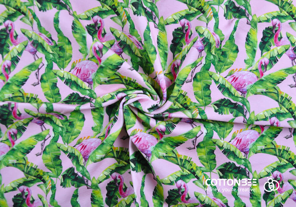 Flamingos took over women’s clothing and accessories. This lean, pink bird with a long neck is a symbol of summer fun, and because of that, you can often see it on swimsuits, beach essentials or summer dresses. Creating a unique garment that will be in accordance with current trends will be possible with fabrics printed on demand. In our catalogue, you will be able to easily find a print that suits all your needs.