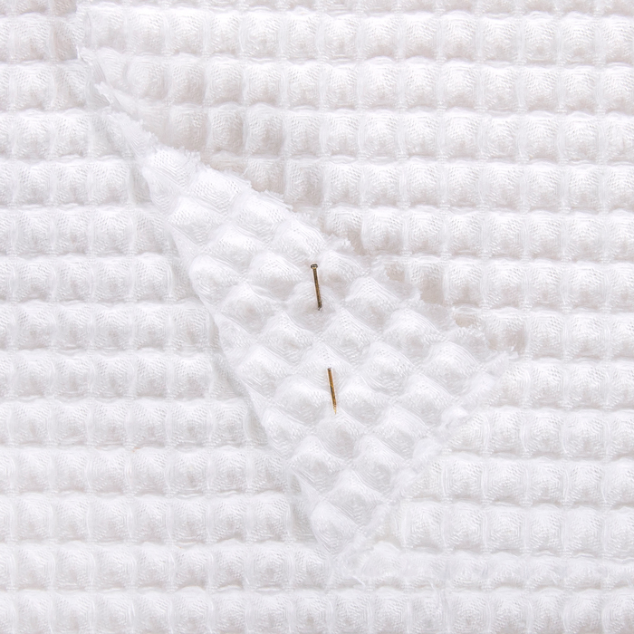 Cotton waffle with OEKO-TEX Standard 100 Class I certificate is a fabric that is completely safe for sensitive skin and allergy sufferers. In direct contact with the skin, it will be pleasant and will not cause irritation, which is why it can be used as a bedding or clothing material. Conventional cotton waffle fabric is breathable and absorbent, so it can be used for swimwear cover-ups or summer wardrobe staples. An interesting waffle texture can add charm to curtains or decorative elements in the interior. You can wash the waffle fabric in the washing machine, so its care will not cause any headaches.