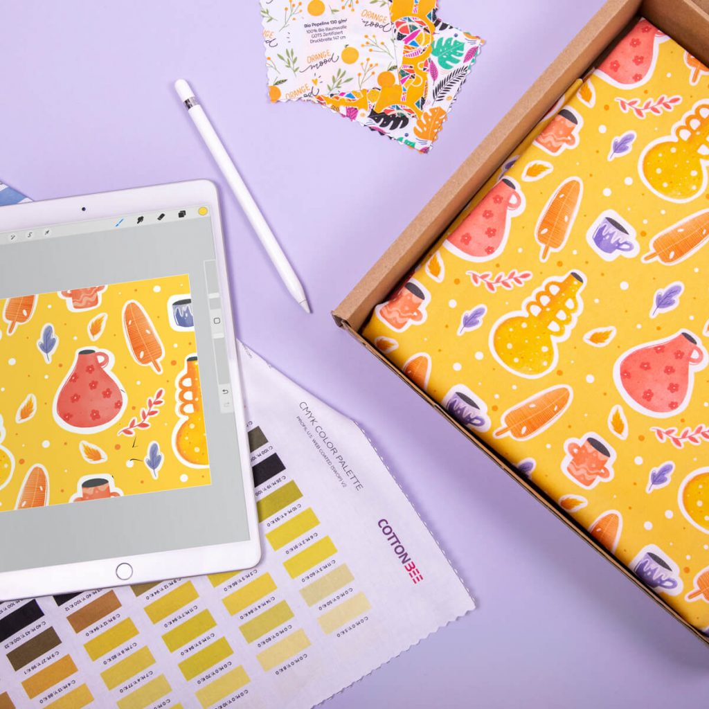 Wzory na materiałach drukujemy z plików w formacie zamkniętym, czyli rastrowych. Mimo to wzory warto projektować w programie, który umożliwia tworzenie plików wektorowych, przykładowo w Illustratorze. Dzięki temu, w każdej chwili możesz dowolnie pomniejszać lub powiększać swój wzór, a następnie eksportować go w formacie .jpg, .png lub.tiff bez obawy, że będzie nieostry. Grafika wektorowa pozwoli Ci także z łatwością łączyć elementy z różnych wzorów i tworzyć z nich nowe projekty do druku. Gotowy projekt zapisz w formacie .tiff, rozdzielczości minimum 150 dpi i palecie kolorów CMYK, w profilu CMYK: U.S. Web Coated (SWOP) v2.